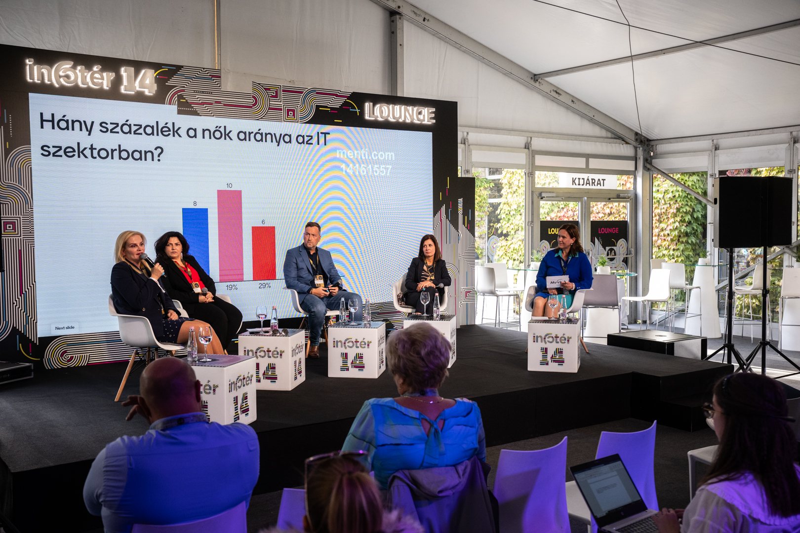 Az Eurostat adatai alapján 10%-kal képviseltetik magukat a nők az IT szektorban. A kvótákat persze senki sem támogatja, egyetértenek abban, hogy mindig a legrátermettebb kollégát kell választani, nemtől függetlenül. Hogy mi lenne az ideális arány, arra változatos válaszokat adtak a vendégek. „12 éve voltam először az Infotér Konferencián, és nagyjából ugyanannyi nőt láttam akkor, mint most. Azt üzenem a szektornak, hogy ideje a változásnak – jelenti ki Zsófia. – Le kell vetkőznünk a tudatalatti előítéleteket is, amik nagyon sokszor nem csak a férfiakban élnek a nőkkel szemben.”